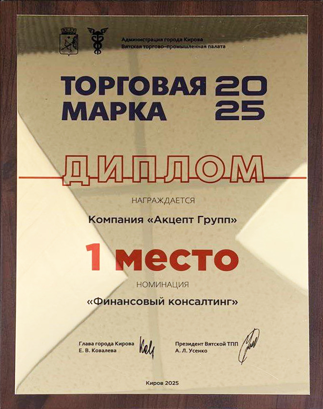 Диплом 1 места в номинации «Финансовый консалтинг» в конкурсе «Торговая марка 2025»